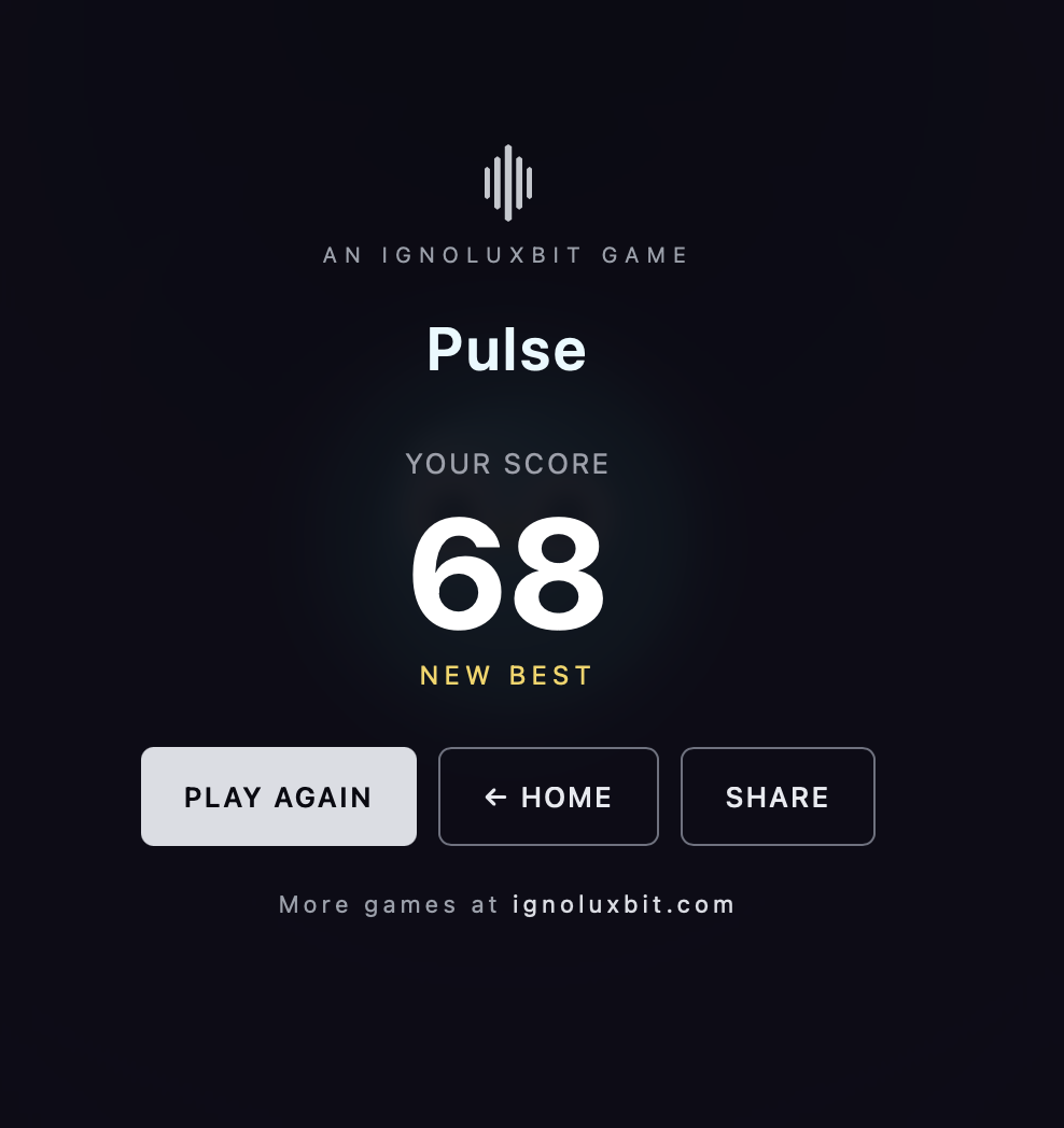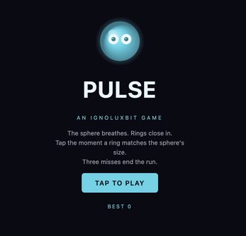 Pulse is a breath-paced timing game. A sphere expands and contracts. A ring drifts toward it. Tap when the ring matches the sphere's radius — earlier, later, anywhere in between, but the closer the better.