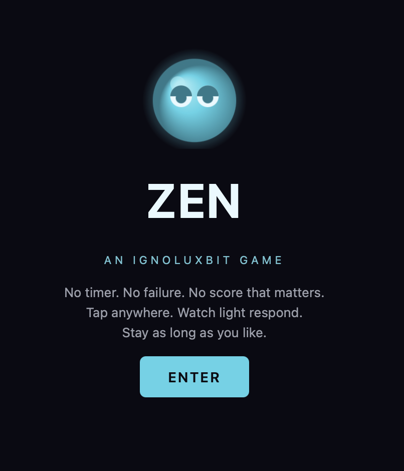 Zen is a no-fail tap surface. Touch anywhere, ripples bloom outward. The little glowing sphere drifts toward where you touched, curious. No score to chase. No game-over screen. Stay as long as you want.